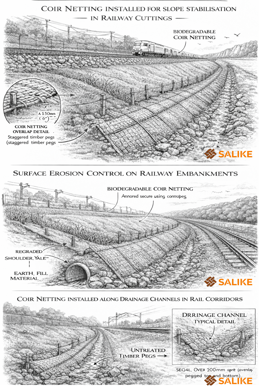 At Salike®, we approach coir netting not as a landscaping accessory, but as a defined engineering component within slope stabilisation strategy — particularly suited to railway cutting slopes, embankment shoulders and transitional drainage zones where surface erosion control is required during vegetation establishment.