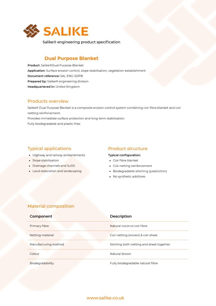 Salike products are designed to provide erosion control, surface stabilisation and ecological enhancement in accordance with their intended application. They do not constitute structural support systems unless expressly stated.