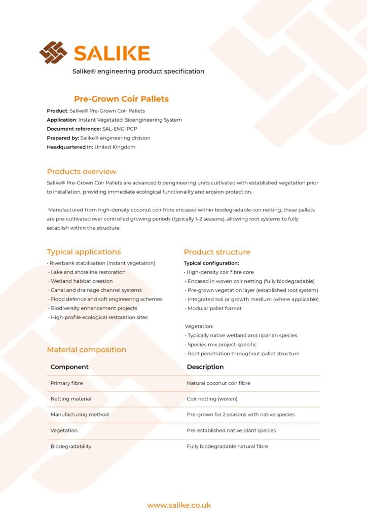 Salike Pre-Grown Coir Pallets are cultivated, ready-to-install natural fibre containment systems designed for aquatic edge protection, wetland restoration and ecological enhancement projects.